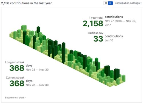 去年の今頃から毎日 GitHub に commit しようと決心し、最近 365 日を達成しました! いい感じ なぜかデフォルト表示の方の左上が白くなってますが、ちゃんと一年経っています。 意図 そもそもなぜ始めようとしたかというと、技術の習得には input と output…